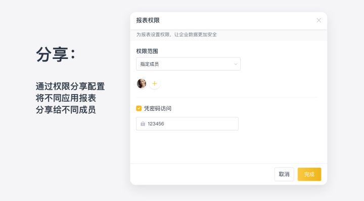 报表的分享权限共有如下几种方式:工作区所有成员可见、指定成员可见、对外开放(任何人可以通过链接进行访问),同时可以设置独立的密码,任何有权限的人员通过密码才能够进行访问。