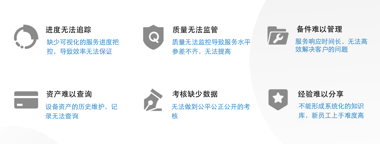 企业在处理ag真人试玩的售后服务工作时,常常会遇到诸如售后工单难管理、服务进度难追踪、售后质量无法做到很好的监管等问题,主要如下: